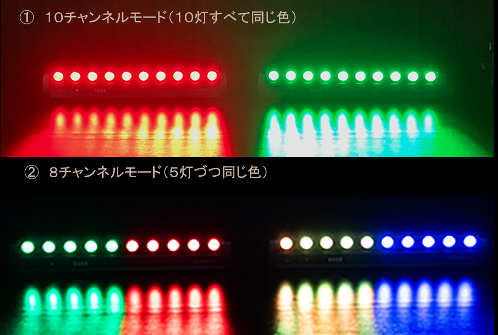しかし、設定を変えれば5灯づつ(8チャンネルモード)、2灯づづ(17チャンネルモード)、1灯づづ(32チャンネルモード)色を変えることもできます。(写真②、③、④)